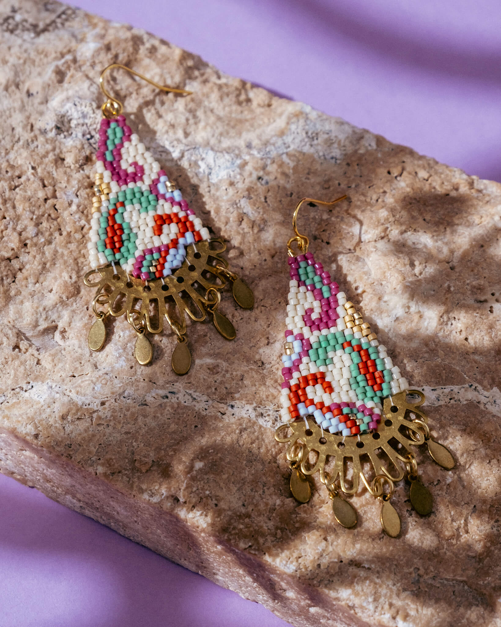 Each pair is hand beaded with premium Japanese glass Miyuki beads. They are lightweight and expressive and offer a statement pair of earrings that remain easy to wear every day.