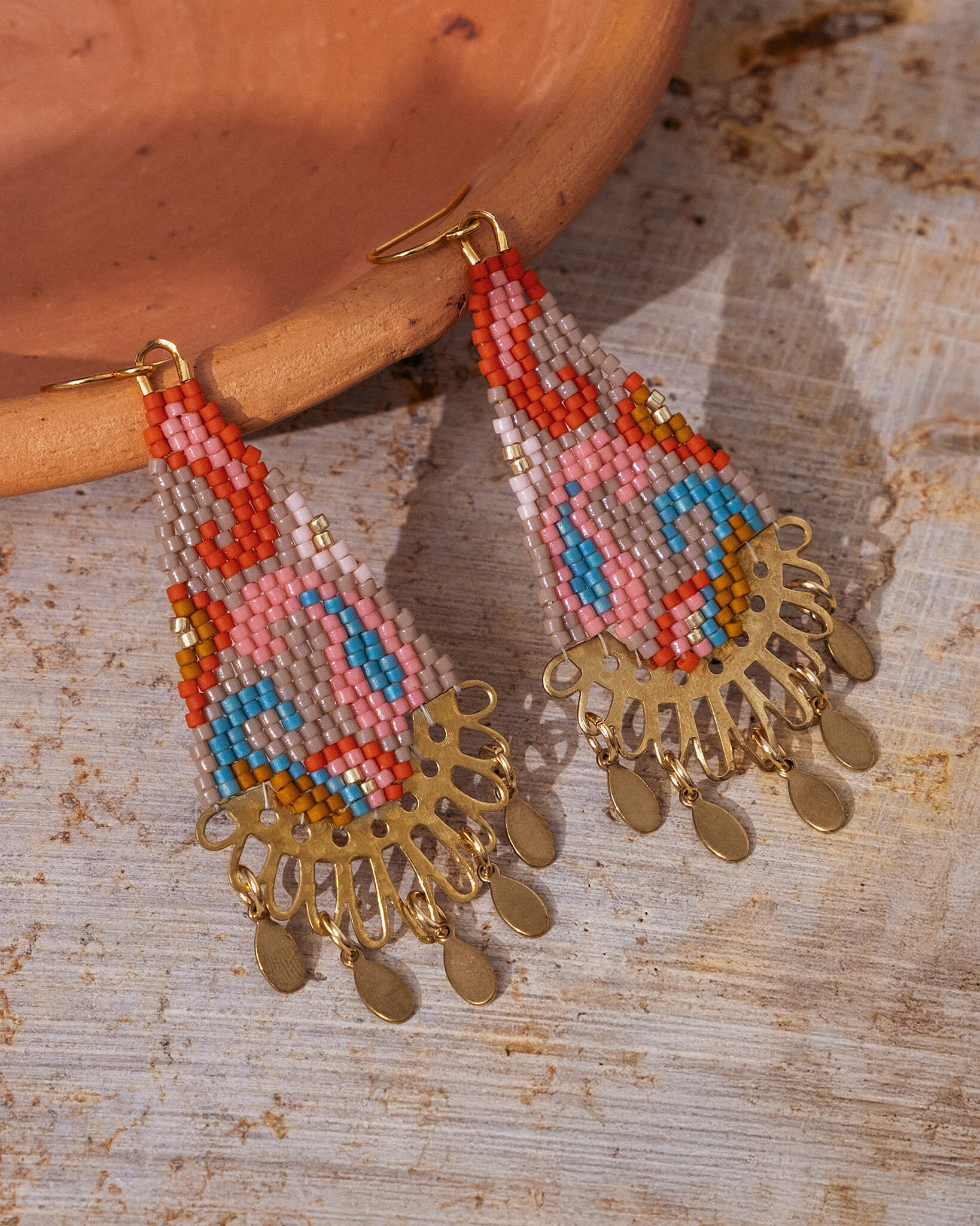 Pair of beaded earrings with blue, orange, and white pattern on a white background Beaded earrings on a textured surface with a candle holder in the foreground