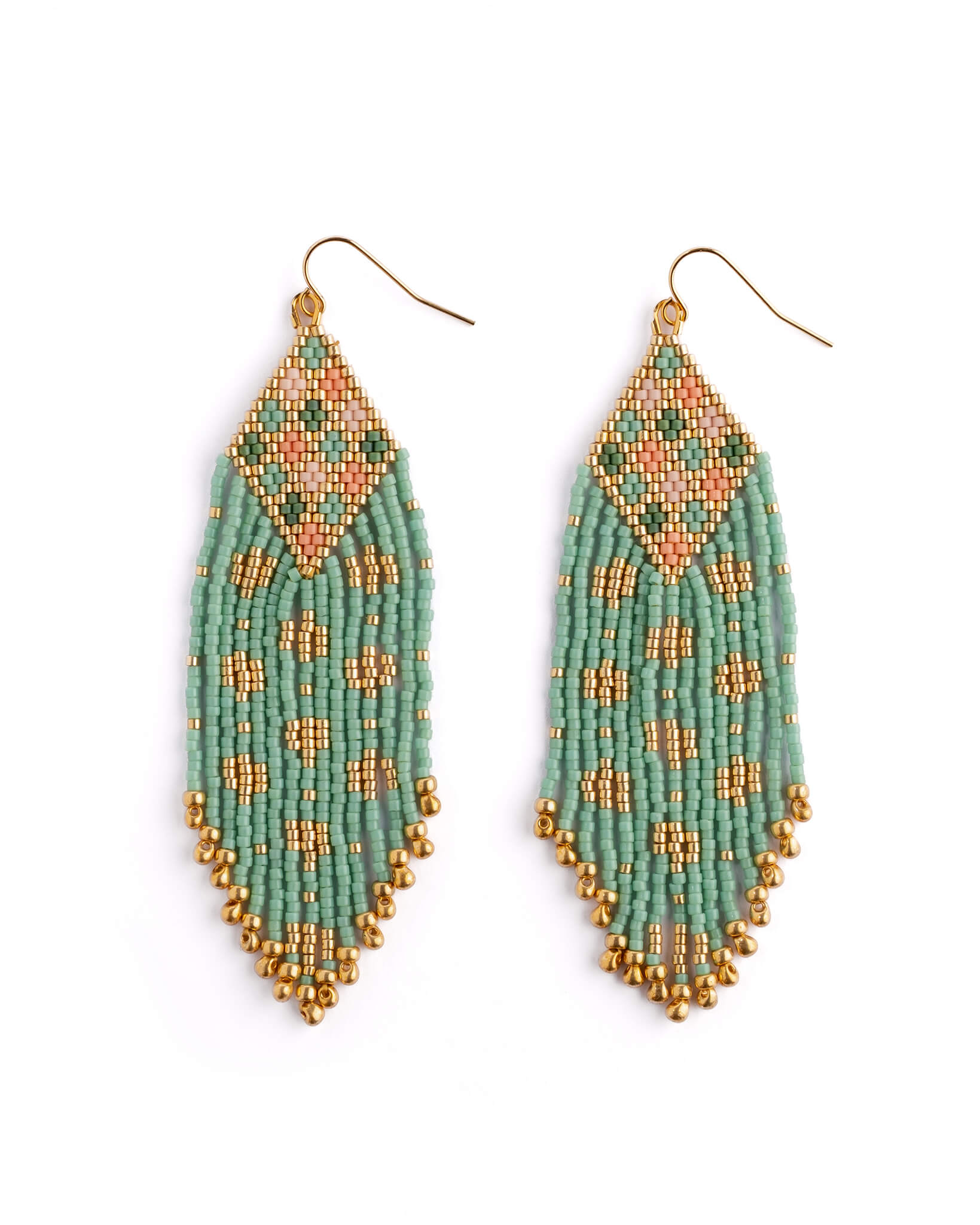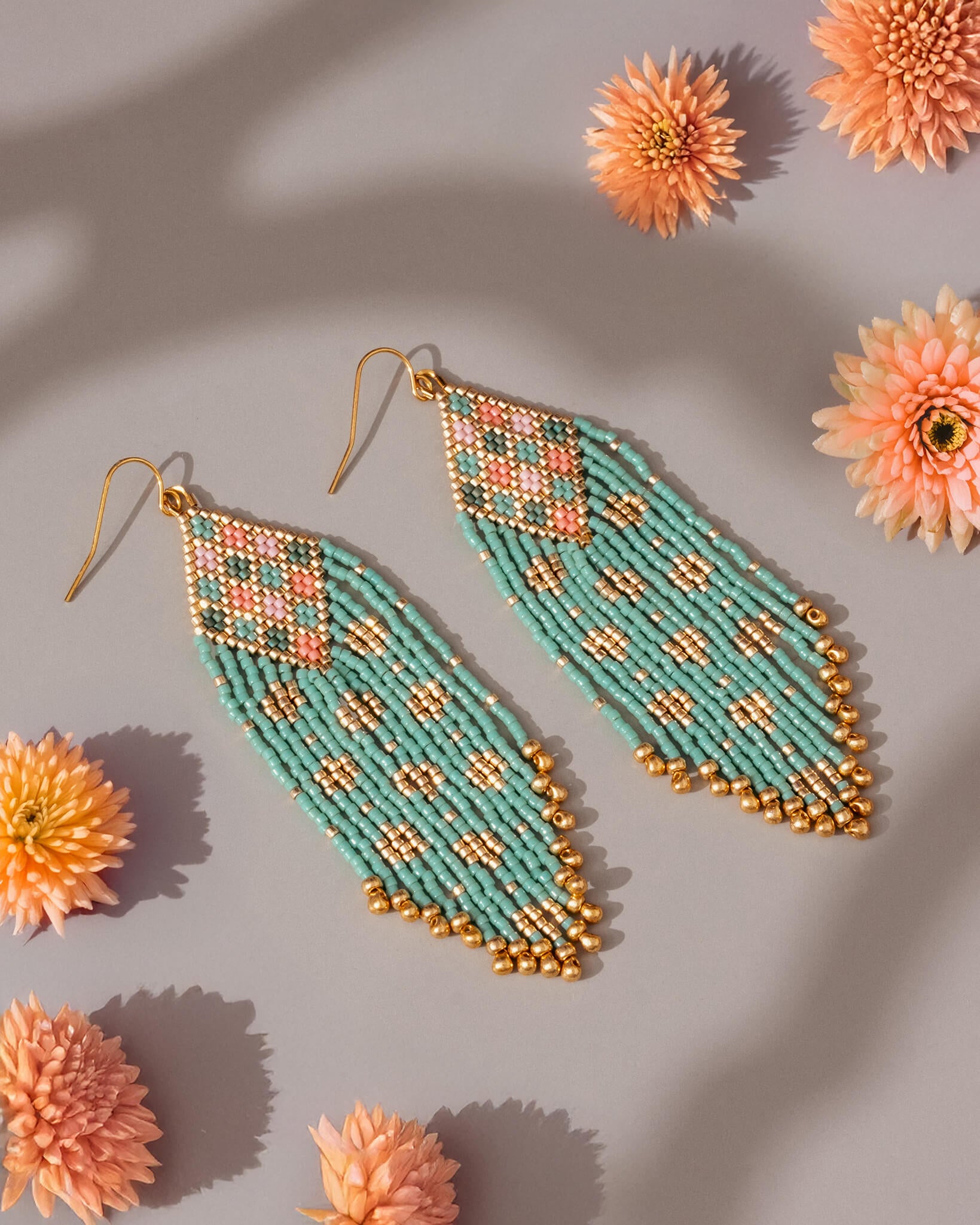 Inspired by the intricate patterns and rich textures of traditional Indian sari textiles, these handwoven earrings feature a geometric diamond motif paired with cascading beaded fringe dotted with gold. Crafted with high-quality Japanese glass beads, the design offers graceful movement and a refined bohemian feel.