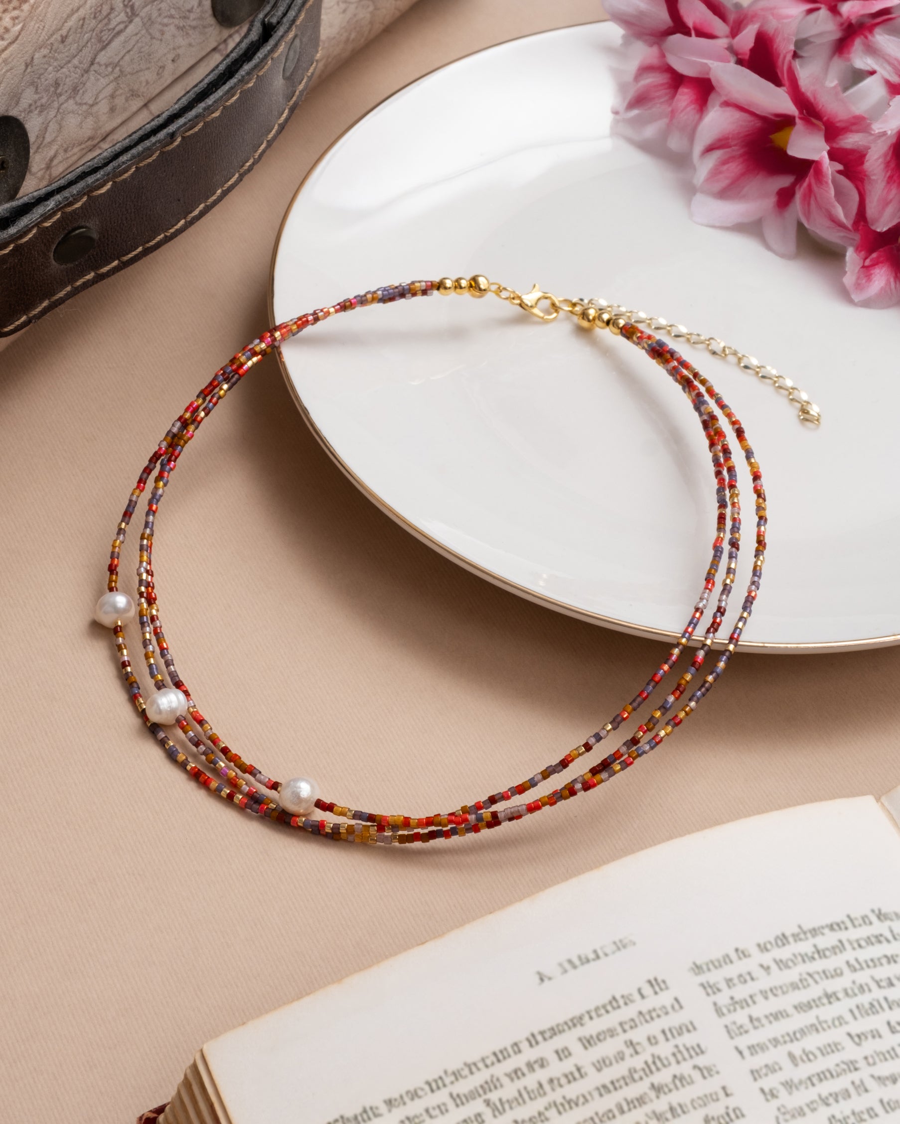 • Handwoven Miyuki and Pearl Layering Necklace (Red/Orange)