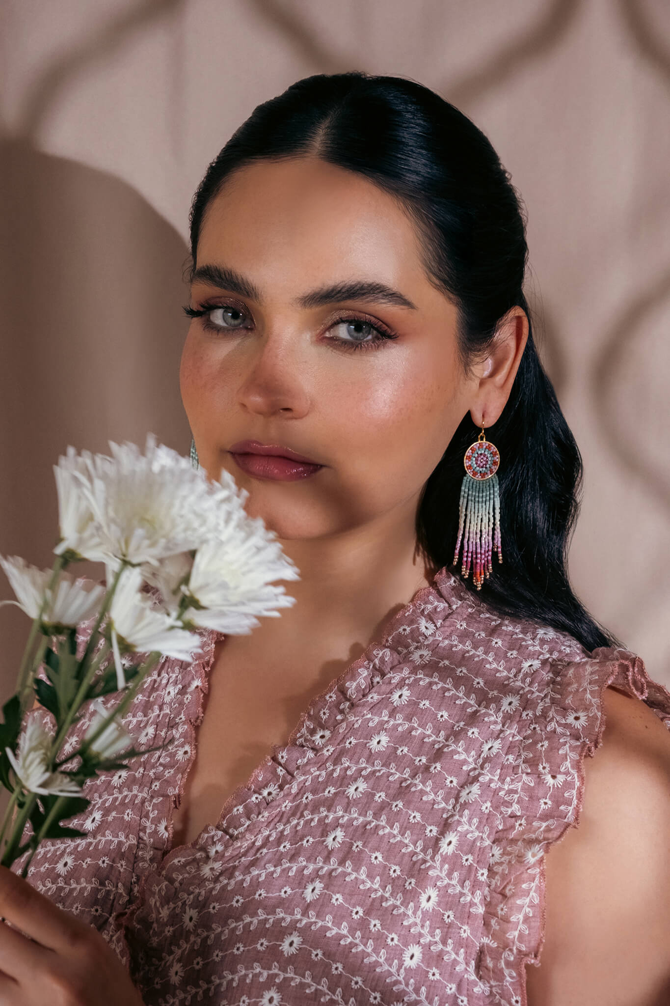 Beaded Handwoven Mandala Fringe Earring (Pink/Green)